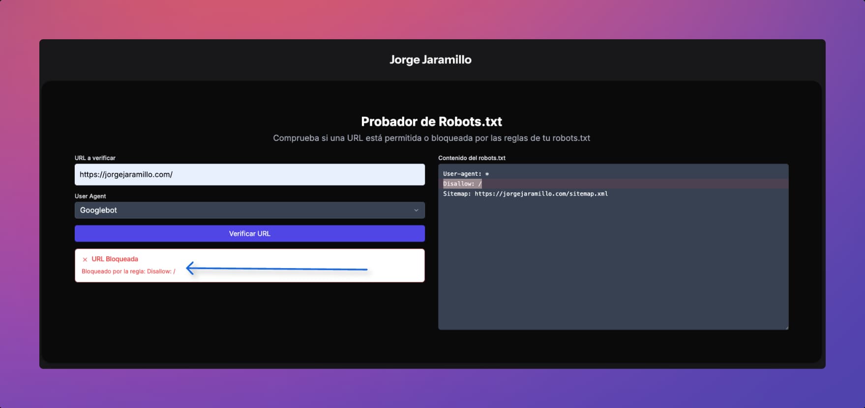1. Validación de URL: Comprueba si una URL específica está permitida o bloqueada según las reglas del robots.txt.